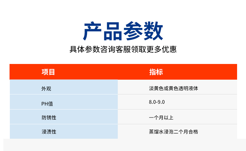 2、本品可按5-10%的比例加入清洗剂、切削液当中,可增强工序间的防锈。