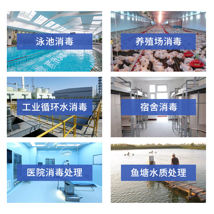 【使用方法】1、游泳池消毒:游泳池内每立方米每天投入3~5克。